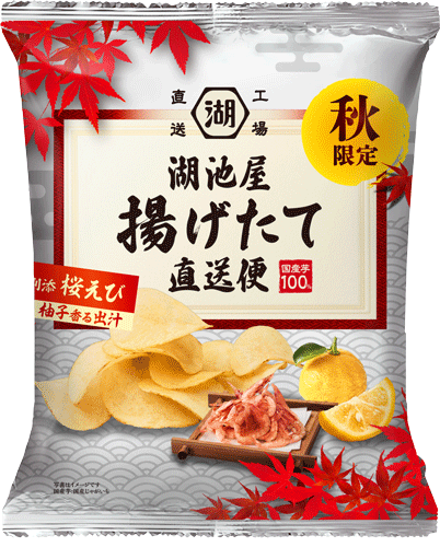 【日本の“秋”を“揚げたて”ポテトチップスで味わう】 「秋の揚げたて直送便 柚子香る出汁」 10月27日(月)より湖池屋オンラインショップで受注販売開始 2025.10.27 株式会社湖池屋(社長:佐藤章)は、2025年8月にリニューアルし、さらに美味しく生まれ変わった「湖池屋揚げたて直送便」シリーズから、秋限定の味わい「秋の揚げたて直送便 柚子香る出汁」を、2025年10月27日(月)より湖池屋オンラインショップにて受注販売を開始します。 お客様から好評の“桜えび”を別添! この度発売する「秋の揚げたて直送便 柚子香る出汁」は、2025年3月に発売した「春の工場直送便」、同年7月に発売した「夏の工場直送便」に続いて、日本の季節を“揚げたて”ポテトチップスで楽しむ逸品です。 今回は、別添するトッピング素材として、春と秋に旬を迎える“桜えび”を選定しました。じゃがいも本来のうまみをお楽しみいただけるよう、鰹と昆布の出汁に、ふわりと柚子が香る優しい味わいに仕立てました。桜えびをお好みのサイズに砕いてポテトチップスにかけていただくことで、柚子と桜えびの2つの素材が風味を引き立てあう、奥深い味わいをお楽しみいただけます。 晩酌のお供や、ご自身へのご褒美、大切な方へのギフトなどにもおすすめです。秋限定の特別な美味しさを、揚げたてのポテトチップスでぜひお楽しみください。 ■「湖池屋揚げたて直送便」について じゃがいもを薄くスライスして油で揚げるポテトチップスは、揚げたてのタイミングが最もじゃがいも本来の旨みと軽い食感を楽しむことができます。できる限り、ポテトチップスの原点である“揚げたてのポテトチップス”のおいしさをお客様の手元にお届けしたいという思いから、製造後の品質検査をクリア次第、すぐに出荷できる体制が組まれています。これにより工場での生産3日以内の出荷を実現し、できたて新鮮な味わいと食感をそのままお届けしています。 また、国産じゃがいもを100%使用しており、揚げたてゆえに油っこさがなく、じゃがいも本来の旨みが繊細に際立ったポテトチップスの旨みを存分にお楽しみいただけます。 「湖池屋工場直送便」として2015年に発売して以降、その新鮮な風味と食感をご評価いただき、完全受注生産という販売形態をとりながらも、おかげさまで累計900万食を突破しました。 【商品概要】 ■商品名/内容量 「秋の揚げたて直送便 柚子香る出汁」/6袋セット(1袋75g) ※桜えびトッピング/6袋付き(1袋1.5g) ■価格 1箱/1,980円(税込) ※送料別 ■発売日/販売先 2025年10月27日(月)/湖池屋オンラインショップ ※受注期間:2025年10月27日(月)12時〜11月4日(火)17時まで ■湖池屋オンラインショップ 販売ページ (URL)https://www.koikeya-online.jp/shop/lp/chokusoubin_autumn.aspx 【一般のお客様からのお問い合わせ先】 株式会社湖池屋 お客様センター Tel.0120-941-751 受付:月〜金 9:00〜17:00 (祝日除く) 【このリリースに関するお問い合わせ先】 株式会社湖池屋 広報部:伊藤/小幡 Tel. 080-3582-2708 Fax. 03-6872-2613 〒150-0001 東京都渋谷区神宮前6-17-11 JPR原宿ビル8F E-mail. pr@koike-ya.com