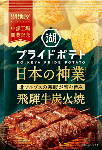 【「湖池屋 中部工場」開業記念商品】 世界に誇る"日本の神業食材(飛騨牛)"をポテトチップスで存分に味わう 「湖池屋プライドポテト 日本の神業 飛騨牛炭火焼」新登場 2025.11.04 株式会社湖池屋(社長:佐藤章)は、2025年12月に湖池屋 中部工場(岐阜県海津市)を開業することを記念して、岐阜県を代表する食材“飛騨牛”を使用した逸品「湖池屋プライドポテト 日本の神業 飛騨牛炭火焼」を2025年11月3日(月)より全国コンビニエンスストアにて先行発売、2025年11月10日(月)より全国スーパーマーケット他一般チャネルにて発売します。 売上の一部を、多様な価値を生む農業を推進する岐阜県に寄付します 湖池屋は、2025年12月の中部工場 (岐阜県海津市) の開業を機に、岐阜の魅力を商品に込めて全国にお届けしたいという想いから、今回初となる岐阜県との商品展開を実施します。岐阜県との取り組みの第1歩として、「日本の神業」シリーズから、岐阜の豊かな自然や生産者が生み出す神業を中核とした新商品が誕生しました。 当商品は、2023年に国の「地理的表示 (GI) 保護制度※」にも登録された“飛騨牛”を使用しています。“飛騨牛”は、岐阜県の雄大な自然と、季節の寒暖差や昼夜の気温差の中、登録農家による手間暇惜しまぬ優れた肥育技術により磨かれ、守り継がれてきた品種です。きめ細やかで美しい霜降りと芳醇な味わいは、まさに“神業食材”と呼ぶにふさわしい、世界に誇る逸品食材です。 ※地理的表示 (GI) 保護制度:伝統的な生産方法や気候・風土・土壌などの生産地等の特性が、品質等の特性に結びついている産品の名称 (地理的表示) を知的財産として登録し、保護する制度。 フレーバーは、飛騨牛の芳醇な香りに炭火でじっくり焼き上げたような香ばしさがふわりと重なる、香り高い味わいに仕上げました。塩と胡椒で飛騨牛の奥深い旨みを引き立てることで、上品な味わいをお楽しみいただけます。また、ポテトチップス好きが夢中になる美味しさを追求した、プライドポテトの独自製法「やみつきエンドレス製法」を採用することで、飛騨牛の持つ旨みをさらに引き上げる、やみつき感のある味わいを実現しました。 パッケージでは、「日本の神業」によって生まれる“飛騨牛”の品質の高さと“飛騨山脈”の堂々とした荘厳さを力強く描き、山脈の中でも岐阜県にかかる槍ヶ岳をシンボルとして大きくデザインしました。 また、当商品の販売を通じて多様な価値を生む農業を推進する活動に取り組まれている岐阜県を応援したいとの想いから、1袋あたり1円を岐阜県に寄付します。誰でも気軽に参加できる "美味しくて身近" な支援のカタチに取り組んでまいります。 岐阜県が世界に誇る“飛騨牛”の魅力が詰まった逸品「湖池屋プライドポテト 日本の神業 飛騨牛炭火焼」を、存分にお楽しみください。 ■「湖池屋プライドポテト日本の神業」について 2024年より「湖池屋プライドポテト 日本の神業」シリーズはスタートしました。「本当に良いものを作り出すには手間暇を惜しまない」古くから日本に根付くこの精神で作り出された“日本の逸品食材”と、この精神を体現する“手間を惜しまないこだわりの技”を「日本の神業」とし、「湖池屋プライドポテト」に乗せて全国に発信しています。 “地域の素材を活かしたポテトチップス”という領域を超えて、商品を通じた地域貢献や課題解決にも取り組んでいます。 【商品概要】 ■商品名/内容量 「湖池屋プライドポテト 日本の神業 飛騨牛炭火焼」/52g ■価格 オープン価格 ■発売日/販売先 2025年11月3日(月)/全国・コンビニエンスストア先行 2025年11月10日(月)/全国・スーパーマーケット他一般チャネル ■湖池屋プライドポテト 日本の神業 ブランドサイト (URL) https://koikeya-pridepotato.jp/jpp.html 【一般のお客様からのお問い合わせ先】 株式会社湖池屋 お客様センター Tel.0120-941-751 受付:月〜金 9:00〜17:00 (祝日除く) 【このリリースに関するお問い合わせ先】 株式会社湖池屋 広報部:伊藤/小幡 Tel. 080-3582-2708 Fax. 03-6872-2613 〒150-0001 東京都渋谷区神宮前6-17-11 JPR原宿ビル8F E-mail. pr@koike-ya.com