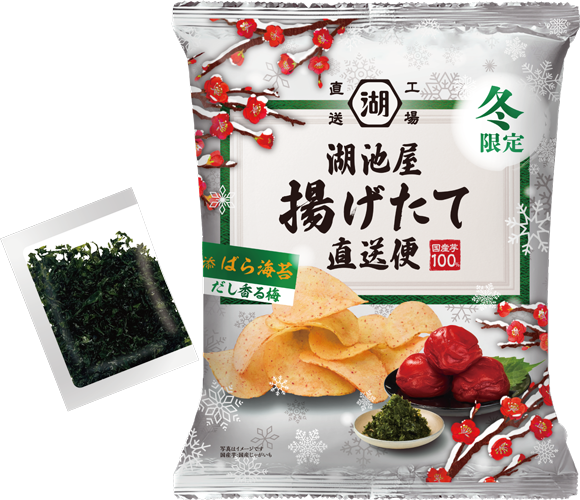 【冬限定!】日本の“冬”を“揚げたて”ポテトチップスで味わう 「冬の揚げたて直送便 だし香る梅」 湖池屋オンラインショップにて受注販売中 2026.01.05 株式会社湖池屋(社長:佐藤章)は、2025年8月にリニューアルし、さらに美味しく生まれ変わった「湖池屋揚げたて直送便」シリーズから、冬限定の味わい「冬の揚げたて直送便 だし香る梅」を、2026年1月1日(木)より湖池屋オンラインショップにて受注販売を開始しました。 香り高い伊勢湾産海苔使用の“ばら海苔”を別添! 「季節の揚げたて直送便」は、揚げたての美味しさをお届けするポテトチップス「湖池屋揚げたて直送便」の“季節限定”商品として2025年3月より販売開始しています。季節ごとの食材を取り入れた味づくりにこだわり、お好みのかけ方で味の変化を楽しめるトッピング素材と一緒にお届けしています。四季を感じる美味しさは多くのお客様から大変ご好評をいただいております。 今回の新商品では、冬限定の味わいとして、新年の始まりにふさわしい縁起の良い「梅」を採用しました。紀州産の梅を使用し、じゃがいも本来のうまみを引き立てるよう、だしの香りがやさしく広がる梅味に仕立てています。梅のまろやかな酸味が心地よく、冬ならではの味わいをお楽しみいただける逸品です。 トッピング素材には香り高い伊勢湾産海苔を使用した「ばら海苔」を別添しています。お好みの量をポテトチップスにかけていただくことで、海苔の豊かな香りと梅の酸味が重なり合い、じゃがいもの旨みを引き立てる、奥行きのある味わいをお楽しみいただけます。 晩酌のお供や、ご自身へのご褒美、大切な方へのギフトなどにもおすすめです。受注期間は1月13日(火)17時まで。この機会に、冬限定の揚げたてポテトチップスをぜひお楽しみください。 ■「湖池屋揚げたて直送便」について じゃがいもを薄くスライスして油で揚げるポテトチップスは、揚げたてのタイミングが最もじゃがいも本来の旨みと軽い食感を楽しむことができます。できる限り、ポテトチップスの原点である“揚げたてのポテトチップス”のおいしさをお客様の手元にお届けしたいという思いから、製造後の品質検査をクリア次第、すぐに出荷できる体制が組まれています。これにより工場での生産3日以内の出荷を実現し、できたて新鮮な味わいと食感をそのままお届けしています。 また、国産じゃがいもを100%使用しており、揚げたてゆえに油っこさがなく、じゃがいも本来の旨みが繊細に際立ったポテトチップスの旨みを存分にお楽しみいただけます。 【商品概要】 ■商品名/内容量 「冬の揚げたて直送便 だし香る梅」/6袋セット(1袋75g) ※ばら海苔トッピング/6袋付き(1袋1.5g) ■価格 1箱/1,980円(税込) ※送料別 ■発売日/販売先 2026年1月1日(木)/湖池屋オンラインショップ ※受注期間:2026年1月1日(木)12時〜1月13日(火)17時まで ■湖池屋オンラインショップ 販売ページ (URL) https://www.koikeya-online.jp/shop/lp/chokusoubin_winter.aspx 【一般のお客様からのお問い合わせ先】 株式会社湖池屋 お客様センター Tel.0120-941-751 受付:月〜金 9:00〜17:00 (祝日除く) 【このリリースに関するお問い合わせ先】 株式会社湖池屋 広報部:伊藤/小幡 Tel. 080-3582-2708 Fax. 03-6872-2613 〒150-0001 東京都渋谷区神宮前6-17-11 JPR原宿ビル8F E-mail. pr@koike-ya.com