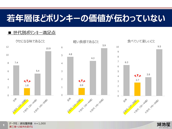 ポリンキーのおいしさが若者に全く伝わっていなかったことが調査の結果判明。