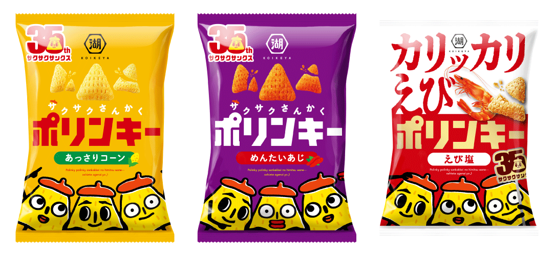 「ポリンキー」は、コーン生地のほのかな甘みとサクサクでくちどけの良い食感が特徴のコーンスナックです。「ポリンキー」をモチーフにしたかわいいキャラクター「スリーポリンキーズ」でおなじみの、親子で楽しめるファミリースナックとして多くのお客様にご愛顧いただき、1990年の発売からおかげさまで36年を迎えました。