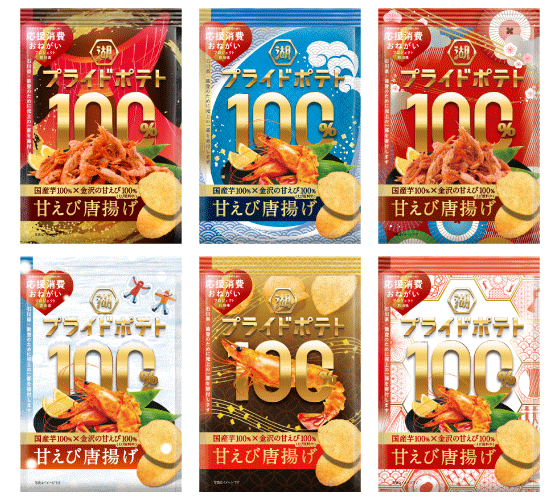 株式会社湖池屋(社長:佐藤章)は、2018年より推進している「湖池屋 JAPAN PRIDEプロジェクト」の取り組みの一環として、新たに「湖池屋プライドポテト100%」シリーズを展開します。商品発売に先駆け、金沢市および金沢美術工芸大学との共同企画として、2026年10月に発売予定の新商品「湖池屋プライドポテト100% 甘えび唐揚げ」のパッケージデザインを一般投票で決定する『2026 湖池屋プライドポテト100% 金沢デザイン総選挙』を、2026年4月28日(火)より実施します。