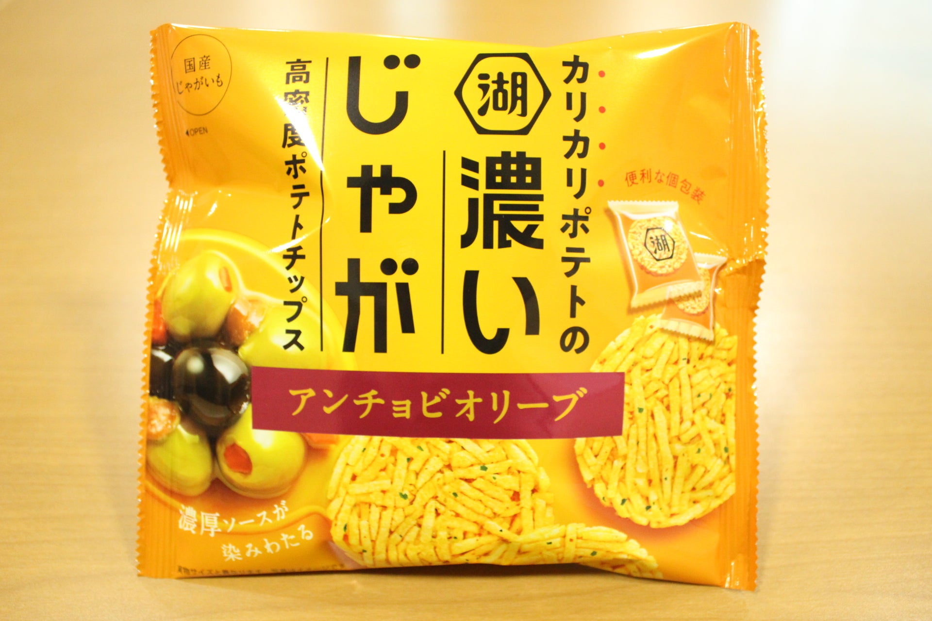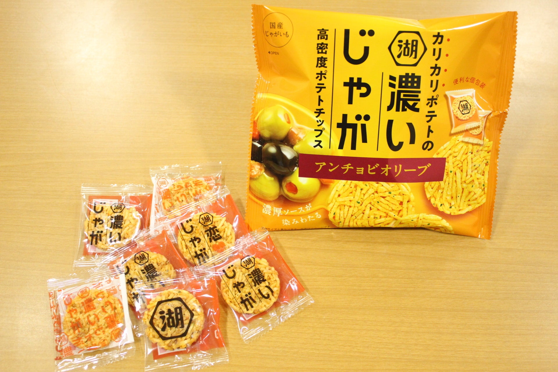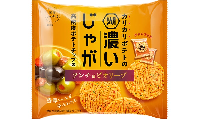 細切りの国産じゃがいもをぎっしり何層にも重ねた"多層食感"、そしてじゃがいもの旨味、アンチョビオリーブの濃厚ソースの味がしっかり感じられる"高密度"な味わいが特長で、湖池屋ポテトチップスラインナップの新機軸になり得る可能性を秘めており、販売に力を入れている。