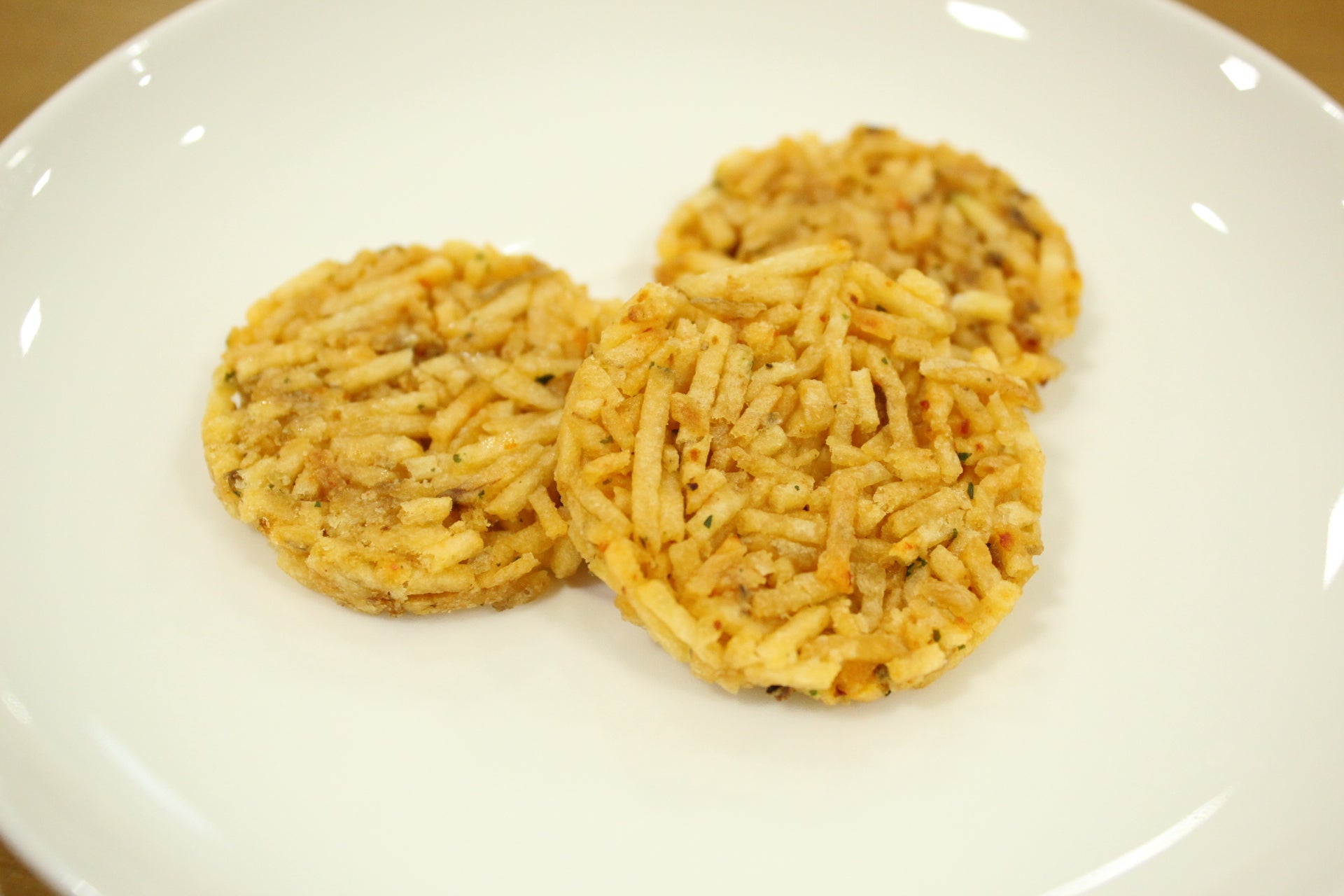 そうして試作を繰り返す中で、じゃがいもを従来の半分以下の細さにカットして揚げ、さらにそれを何層も重ねて平たく丸い形状に成形、オーブンにかけて仕上げてみた。すると、今までにないおもしろい食感と手に取りやすさ、さらには味わいへの好影響も生まれた。
