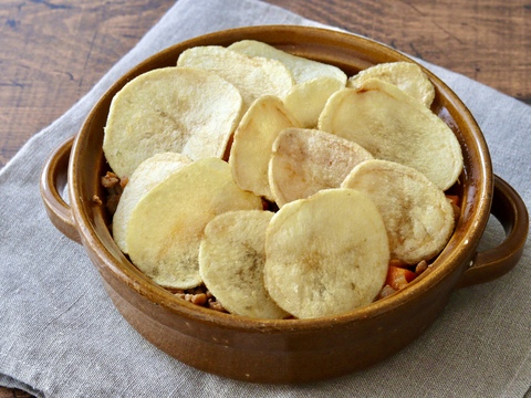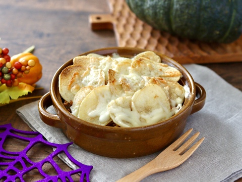 マッシュポテトの代わりに「ピュアポテト オホーツクの塩と岩塩」を使用したお手軽シェパーズパイ!肉厚でシンプルな味わいの「ピュアポテト オホーツクの塩と岩塩」がジューシーなひき肉ソースと相性抜群!仕上げに顔を描けば、パーティーでも盛り上がる可愛らしい一品に♩