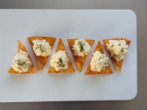 厚みがしっかりとある濃厚な味わいの「ドンタコス ビーフチリタコス」とまろやかな味わいの卵サラダが相性抜群♩ちょっとしたおもてなしにもぴったりのお酒に合う一品です。