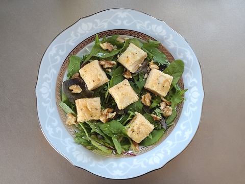 超簡単!フレッシュなベビーリーフにくるみの食感とはちみつのやさしい甘さ、そして「生・チー メルティーチーズ」のサクサク食感と濃厚なチーズのコクが加わったごちそうサラダ♩ワインとの相性抜群の一品です!